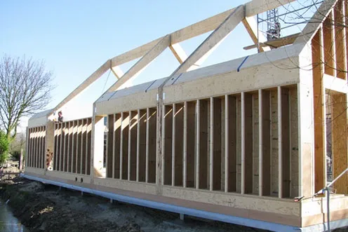 Деревянные двутавровые балки перекрытий, наружные стеновые стойки, внутренние перегородки, стропильная система, кронштейны.